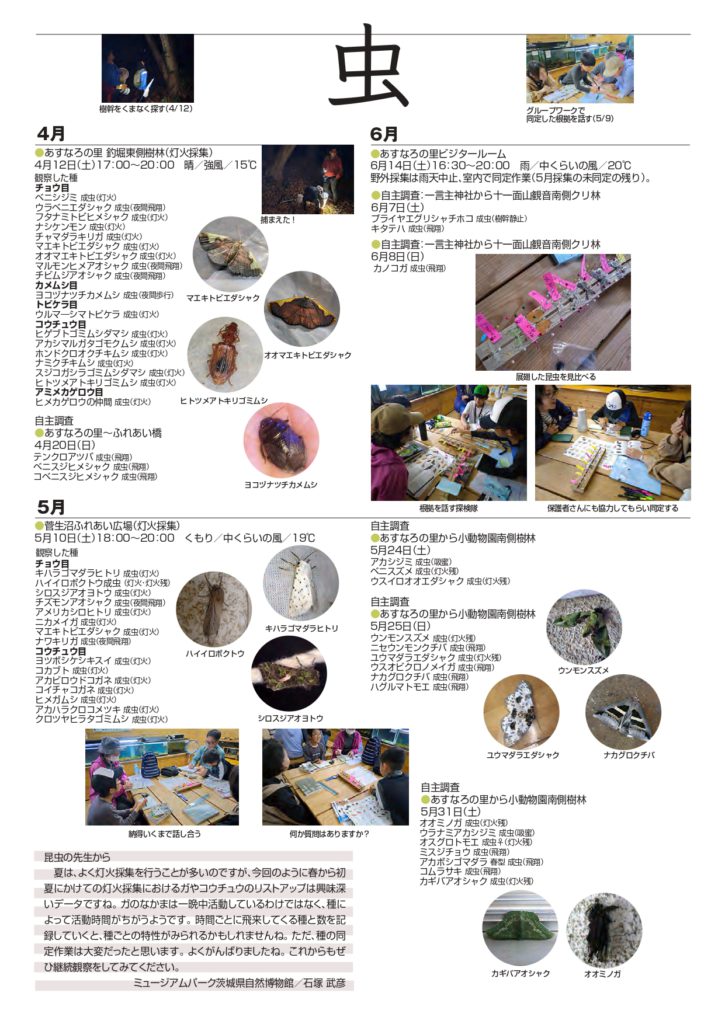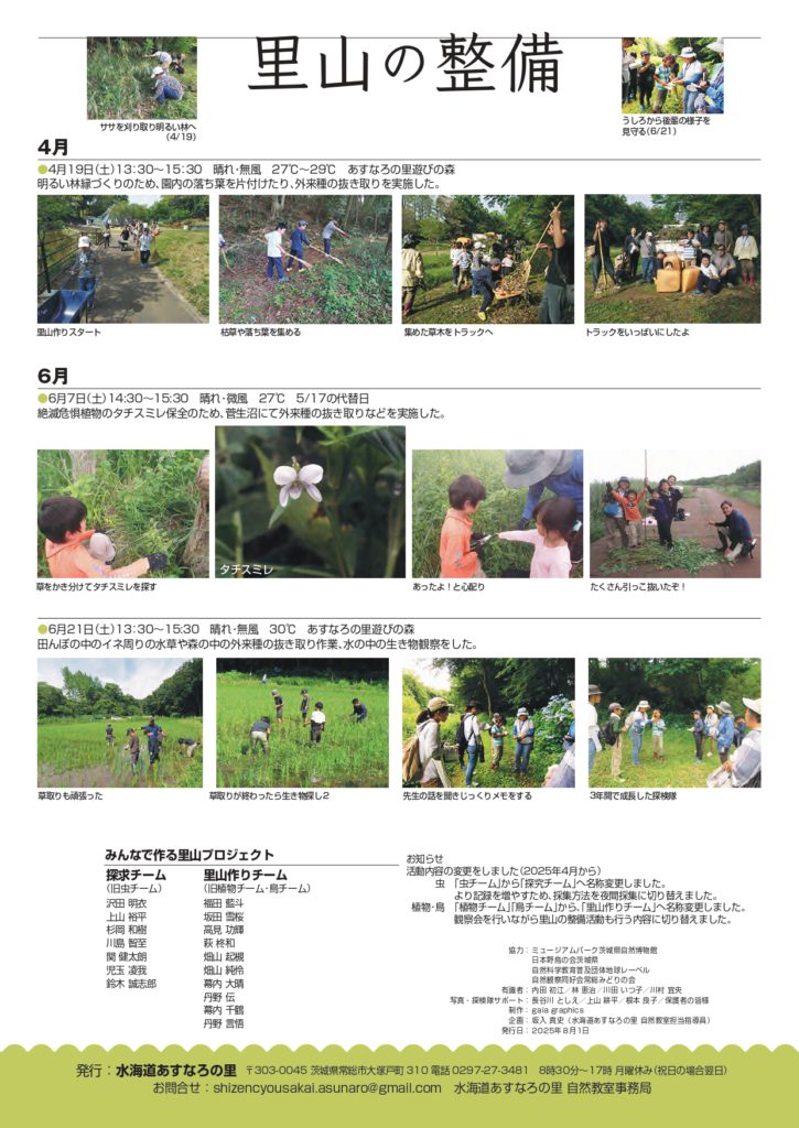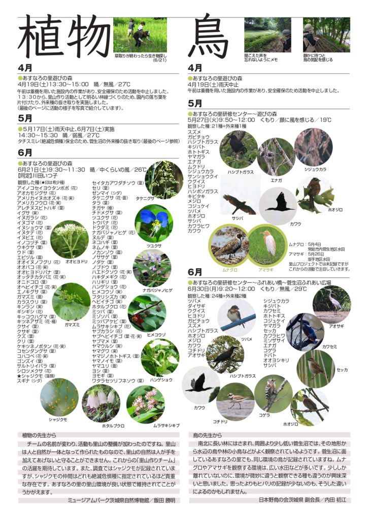 みんなで作る里山プロジェクトにて記録した動植物を「あすなろしぜん便り」内で発表しております。3年目になった当事業では、新しい子ども探検隊も増え、大人も子どもも一緒に菅生沼いきもの調べに臨んでいます。