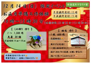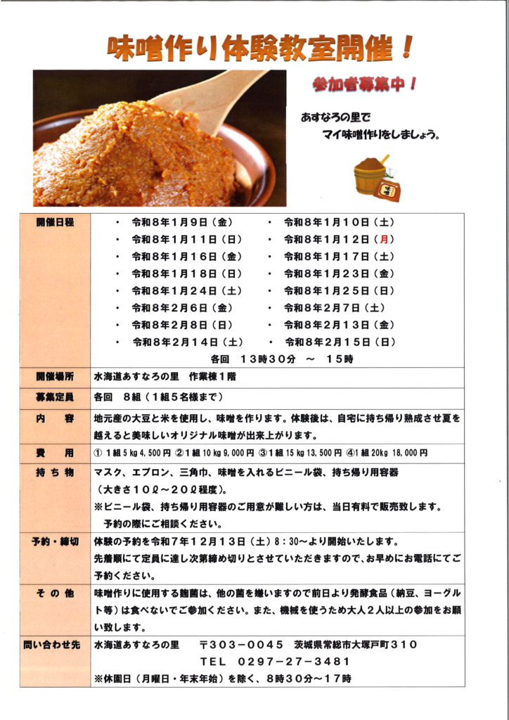 2025年11月28日 / 最終更新日時 : 2025年11月28日 aa142ro5wy 未分類 あすなろ味噌作り体験教室開催のおしらせ あすなろの冬のイベント「味噌作り」今年度も開催します。味噌作りが初めての方、興味のある方ぜひお待ちしています。 体 験 内 容 ※味噌汁1杯で15gの味噌を使用します。 5㎏で約300杯分の味噌汁が作れます。 予約開始は令和7年12月13日(土)8:30から電話にて開始いたします。先着順にて定員に達し次第締め切りとさせていただきますので、お早めにお電話にてご予約下さい。ご質問やご不明な点がありましたらお問い合わせください。
