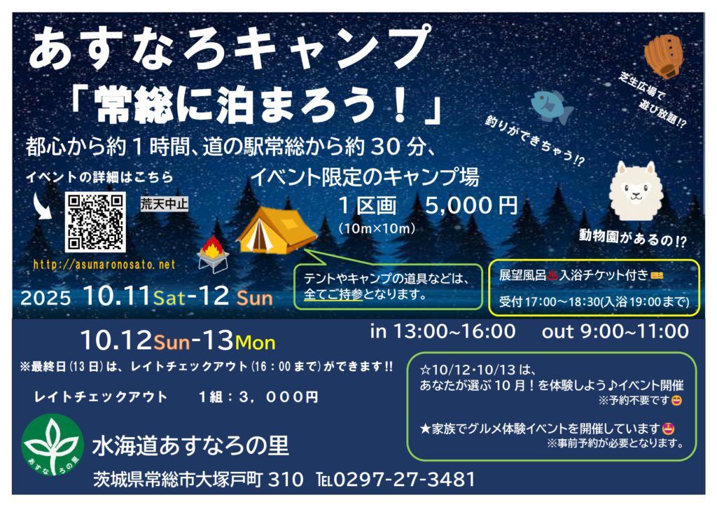 2025年9月20日 / 最終更新日時 : 2025年9月20日 aa142ro5wy イベント 10月【あすなろキャンプイベント】 9月20日(土) 9時より予約受付をスタートいたします😄展望風呂入浴チケット🎫付きです😀ご希望の方は、『あすなろキャンプイベントを予約したい!』とお電話でご予約をお願いいたします✨※テントやキャンプ用具などは全てご持参となります。