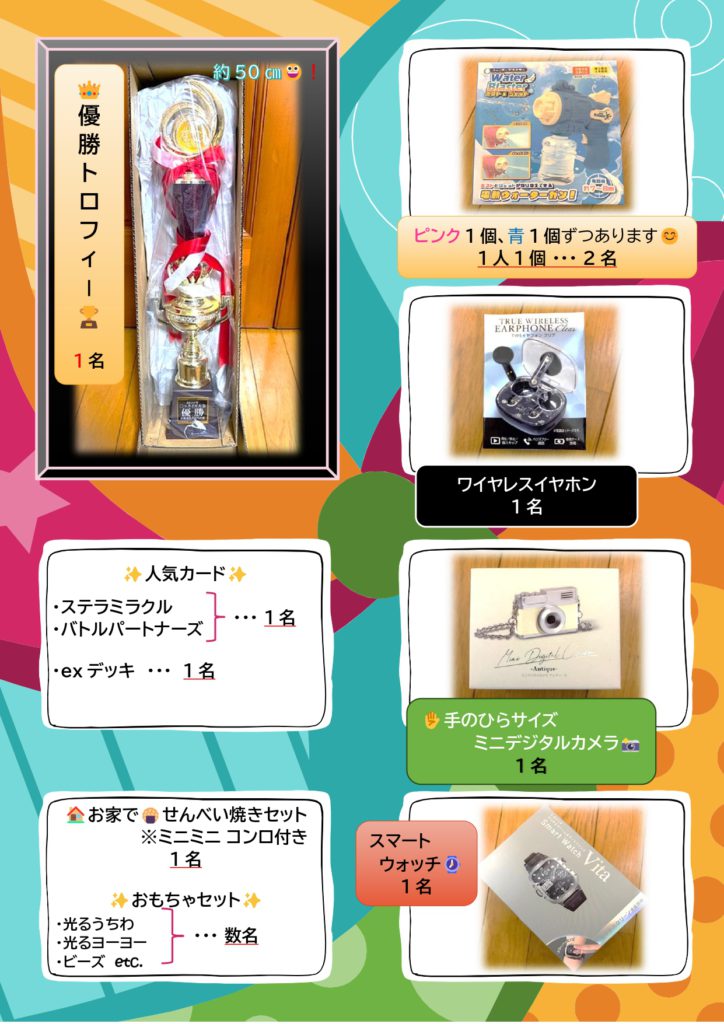 2026年3月28日 / 最終更新日時 : 2026年3月31日 aa142ro5wy イベント 🌸○×クイズ大会🌸景品情報🤩❣ 当日(4月5日)は、優勝目指して頑張ってください😀!優勝者は、トロフィー🏆+お好きな景品1つ🎁いたします😊惜しくも、優勝を逃してしまった方は、優勝者が決まるまで少々お待ちいただき、残りの景品からお好きな景品を1つお選びください😀残りの景品の選ぶ順番に関しては、当日ご説明いたします☺※参加していただいた方、全員へ参加賞があります✨(使い捨てリストバンド1つと参加賞1つ引き換え)