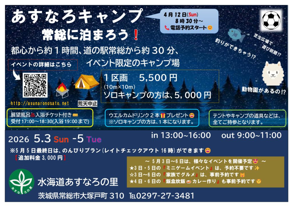 2026年4月10日 / 最終更新日時 : 2026年4月9日 aa142ro5wy イベント ⛺あすなろキャンプ・BBQイベント 4月12日(日)8時30分より、電話予約を開始します🌞●あすなろキャンプは、5月3日・4日・5日 あすなろキャンプ予約の方、今年はウェルカムドリを準備しております🤩●あすなろBBQは、5月3日・4日・5日・6日 あすなろBBQ予約の方、ポップアップテントだけではなく、今年は宿泊ようのテント⛺も張ってBBQができます🤩 ご予約のお電話お待ちしております✨ ※RECAMP常総のキャンプとは異なります。 お間違いないよう、よろしくお願いいたします。