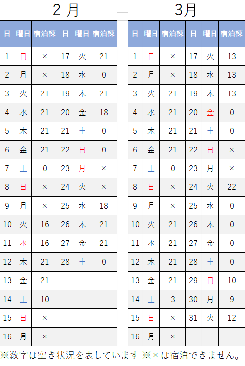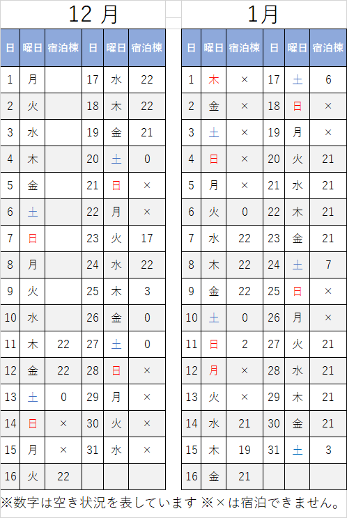 宿泊棟予約状況(12月10日現在)